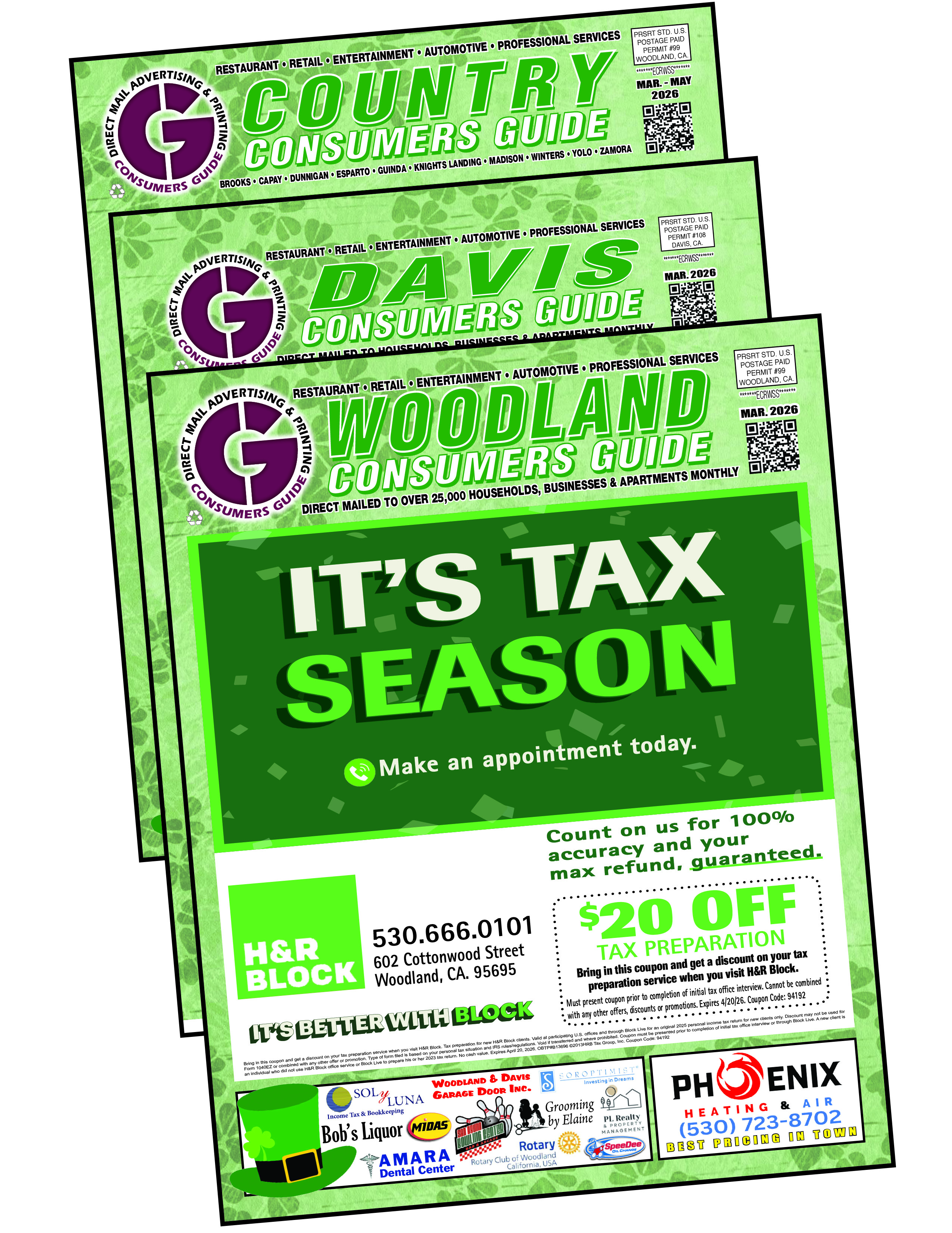 Consumers Guide reaches over 50,000 mailboxes monthly and over 60,000 mail boxes quarterly saturating Yolo County.